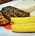 Cooked yam and plantain with palm oil based spinach and egg stew
