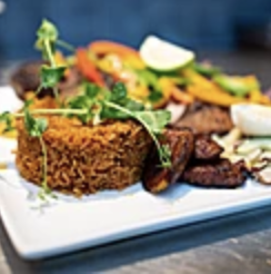 Rice marinated in tomato based stew with fried plantain & side salad (VG option)